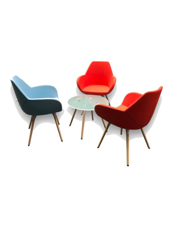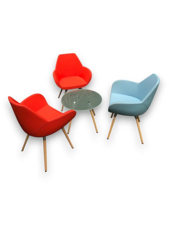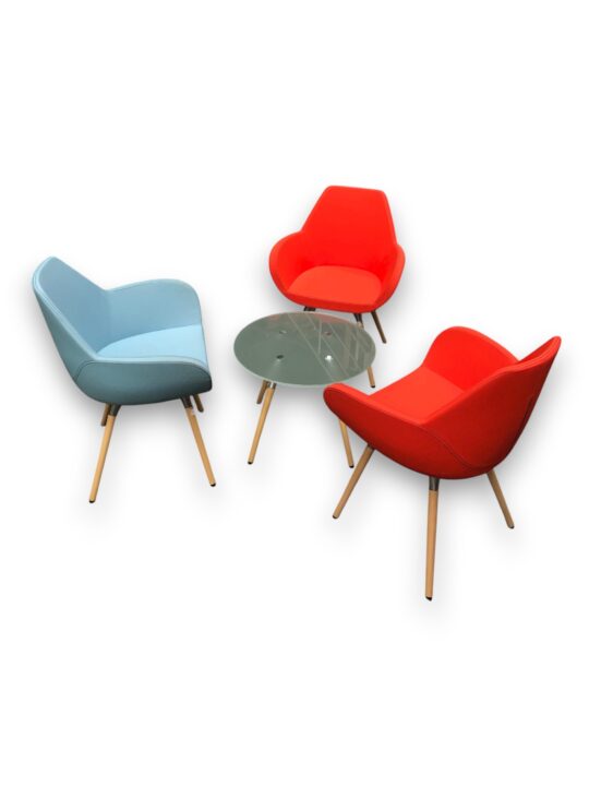 2 fauteuils coque PROFIM FAN 10HW, tissu ROUGE, piètement Hêtre massif,