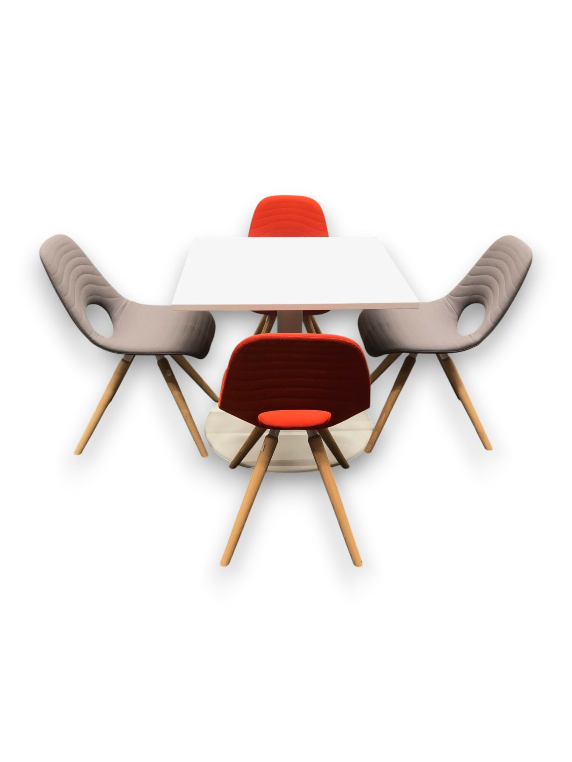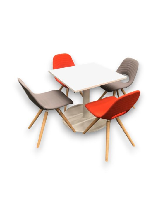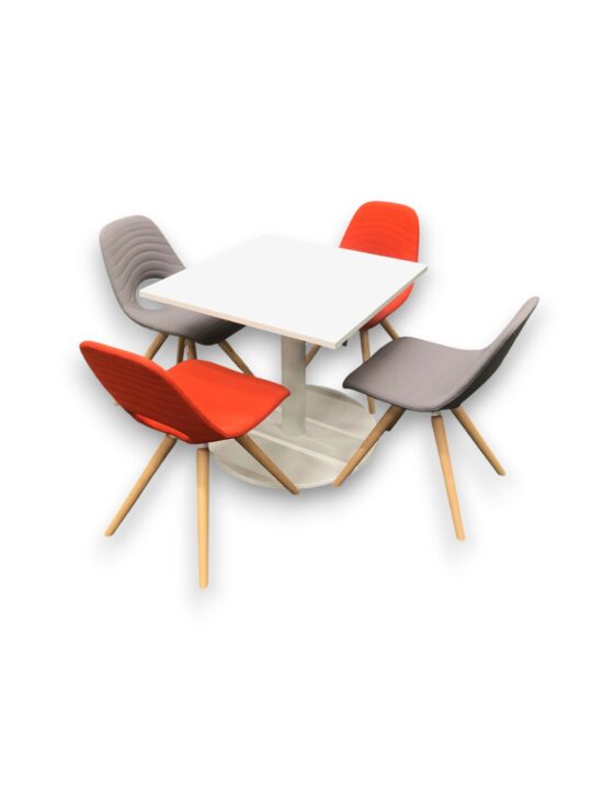 - 1 table carrée mélaminé Blanc, sur 1 pied central laqué Blanc, LxP 800mm.
